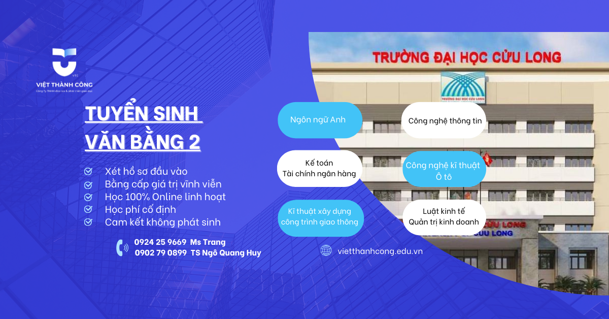 Tuyển sinh VĂN BẰNG 2 hệ từ xa của Đại Học Cửu Long là chương trình giáo dục dành cho những người đã có ít nhất một bằng đại học và muốn học thêm một ngành khác để lấy thêm một văn bằng đại học thứ hai. Chương trình này thường được thiết kế để cung cấp kiến thức chuyên sâu và kỹ năng cần thiết trong một lĩnh vực mới, giúp người học mở rộng cơ hội nghề nghiệp hoặc thay đổi hướng đi trong sự nghiệp của họ.